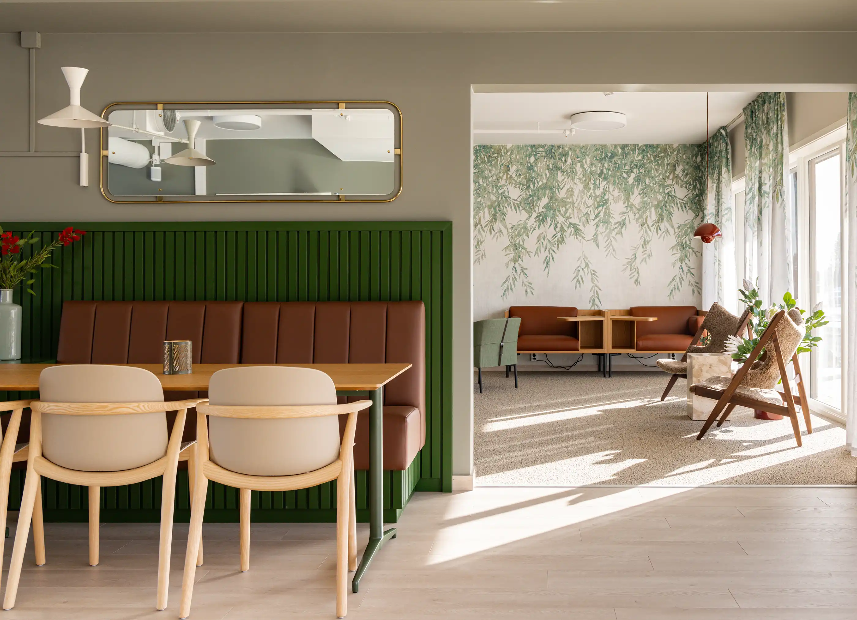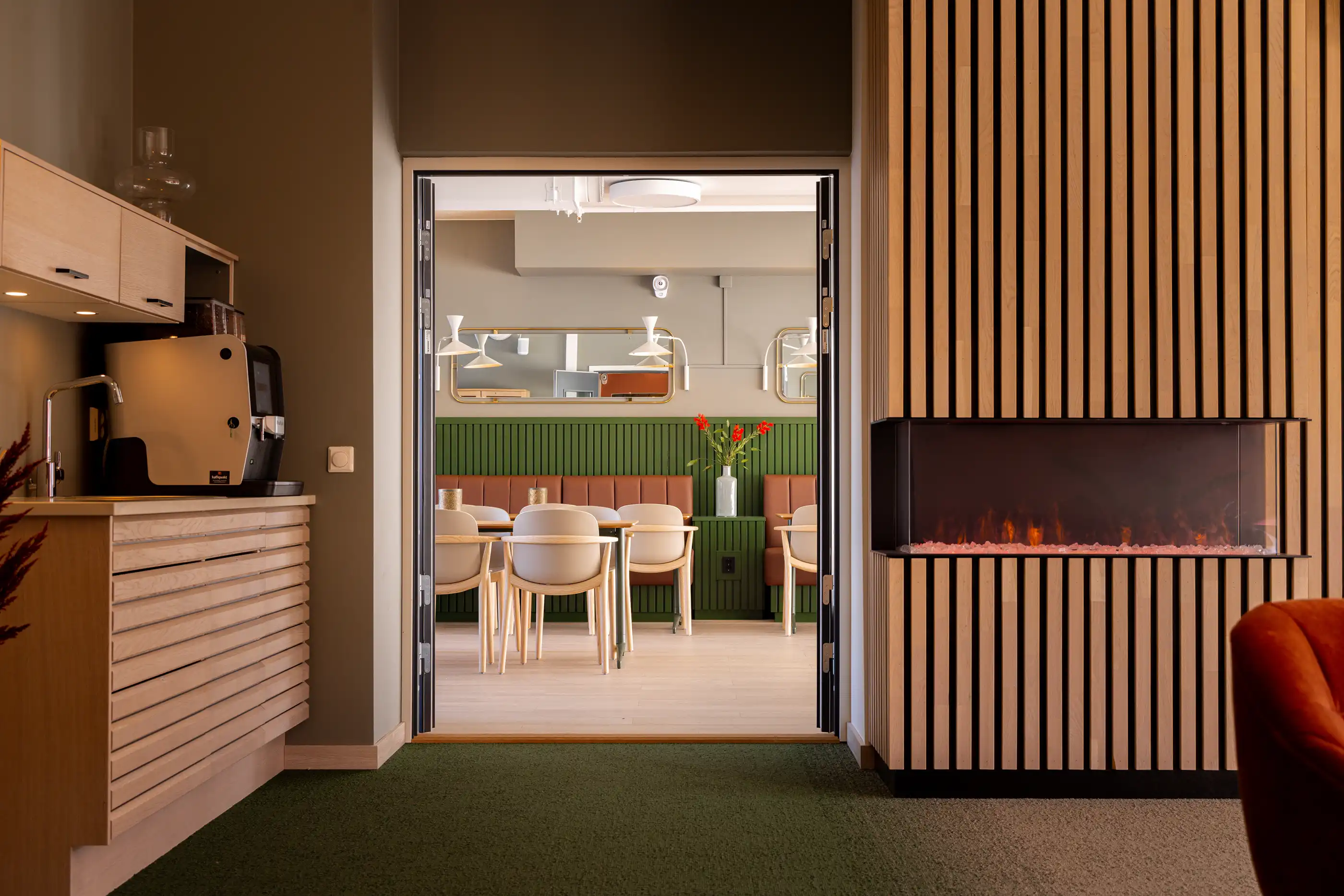 I selskapsrommet legges det til rette for sosiale treff, tema-kvelder og felles middager for beboere. Det er også mulig å leie lokalet, med tilhørende kjøkken, til private selskap. Her blir det også fine arbeidsplasser du kan benytte.